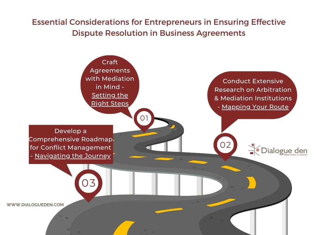 Prioritizing effective dispute resolution in business agreements is akin to embarking on a road trip as an entrepreneur. By crafting agreements with mediation in mind, conducting extensive research on arbitration and mediation institutions, and developing a comprehensive conflict management roadmap, entrepreneurs can set the right steps, map their route, and successfully navigate the journey of resolving conflicts. Embracing these considerations ensures that entrepreneurs are well-equipped to address and resolve disputes in a fair, constructive, and timely manner, ultimately reaching their destination of long-term success.